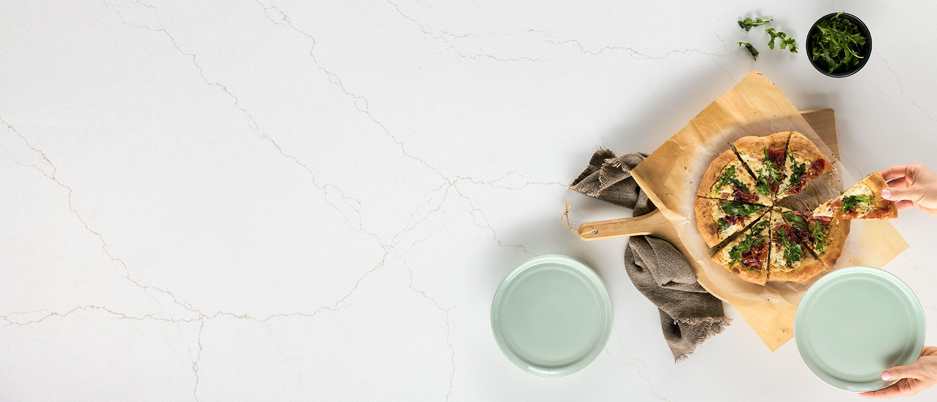 Taj Mahal quartzite-inspired quartz, featuring a two-toned beige background with beige and taupe veining.
